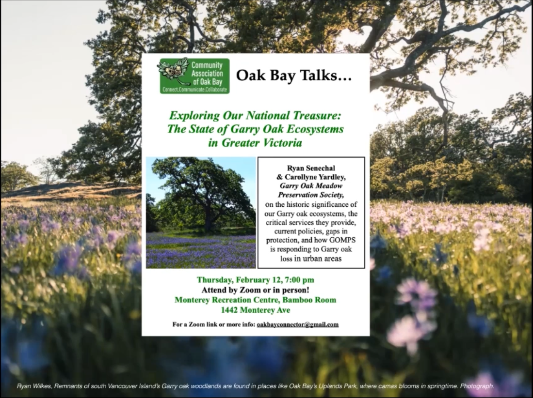 GOMPS – Community Association of Oak Bay. Thursday, February 12, 2026, at 7:00 pm. Zoom and in person. Monterey Recreation Centre, Bamboo Room. Oak Bay Talks presents: Exploring Our National Treasure: The State of the Garry Oak Ecosystems in Greater Victoria. Ryan Senechal and Carollyne Yardley, Garry Oak Meadow Preservation Society, on the historic significance of the Garry oak ecosystems, the critical services they provide, current policies, gaps in protection, and how GOMPS is responding to Garry oak loss in urban areas. Links Community Association of Oak Bay https://www.oakbaycommunityassociation.org Garry Oak Meadow Preservation Society https://www.garryoak.info