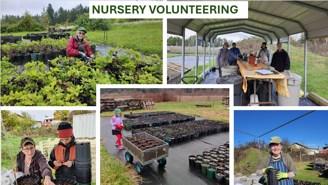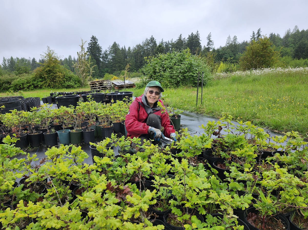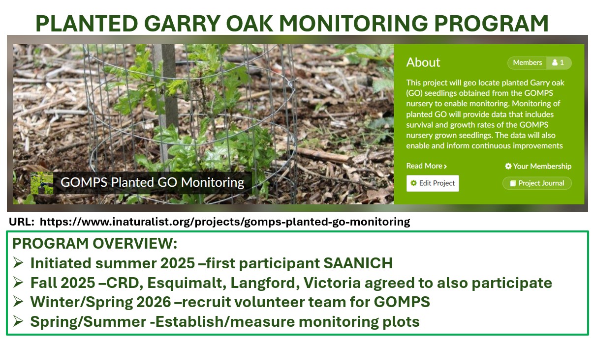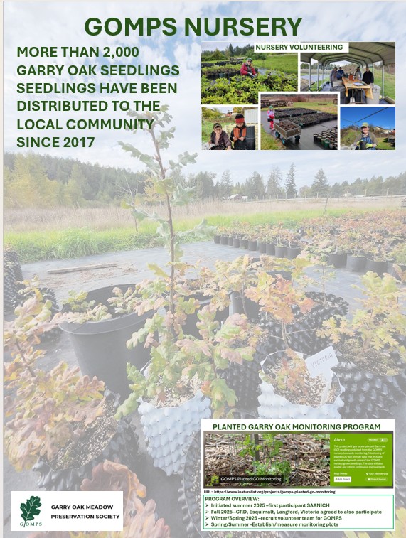 In 2017, GOMPS partnered with City of Victoria at the Bear Hill Nursery site and we began cultivation of Garry oak trees using locally sourced acorns donated by community members. After trialling several different container-growing approaches using thousands of community-donated acorns, many hundreds of seedlings have now been distributed and planted across the region (and beyond). The nursery is funded in part by two generous legacies of local estates, and from purchasers of our tree seedlings. Our nursery is operated entirely by volunteers.