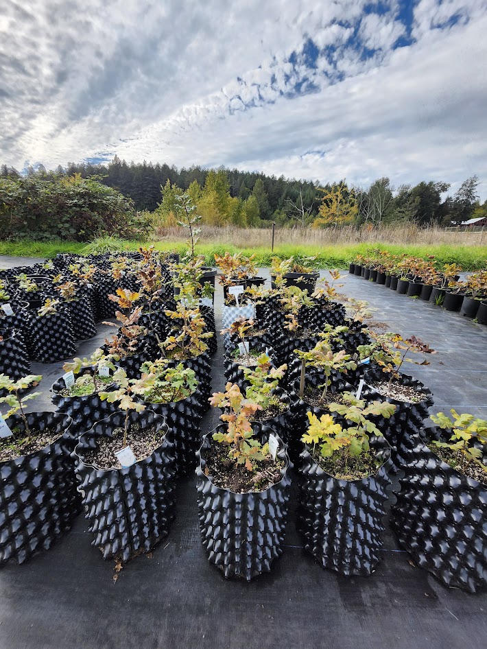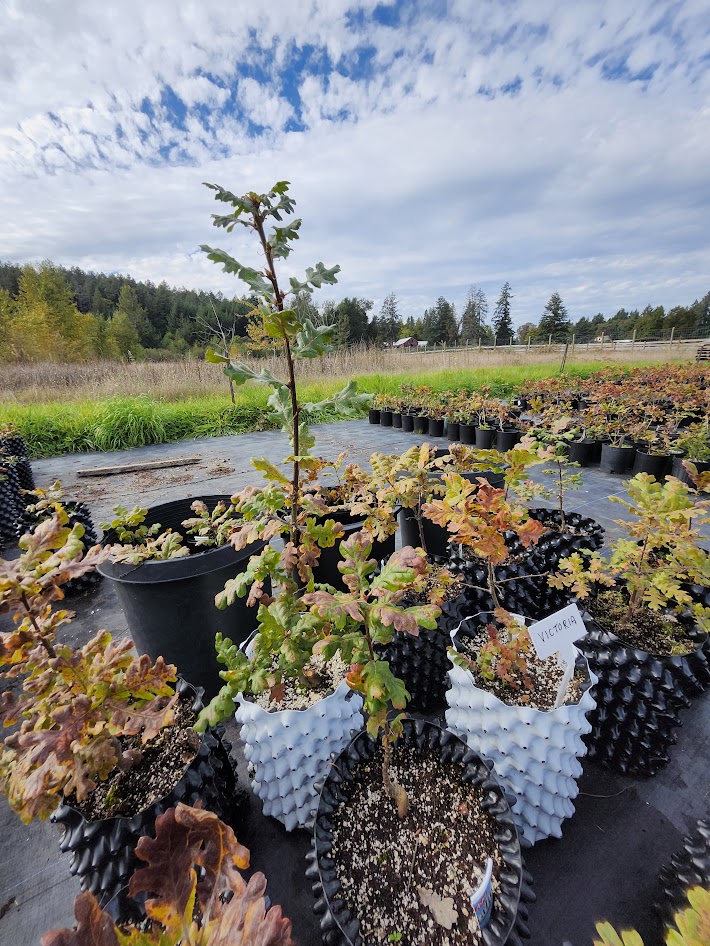 We grow trees in containers from community-sourced acorns for your project, big or small. Our air-pruned, 2.5 gal. container Garry oak seedlings are available for a suggested donation of $50.