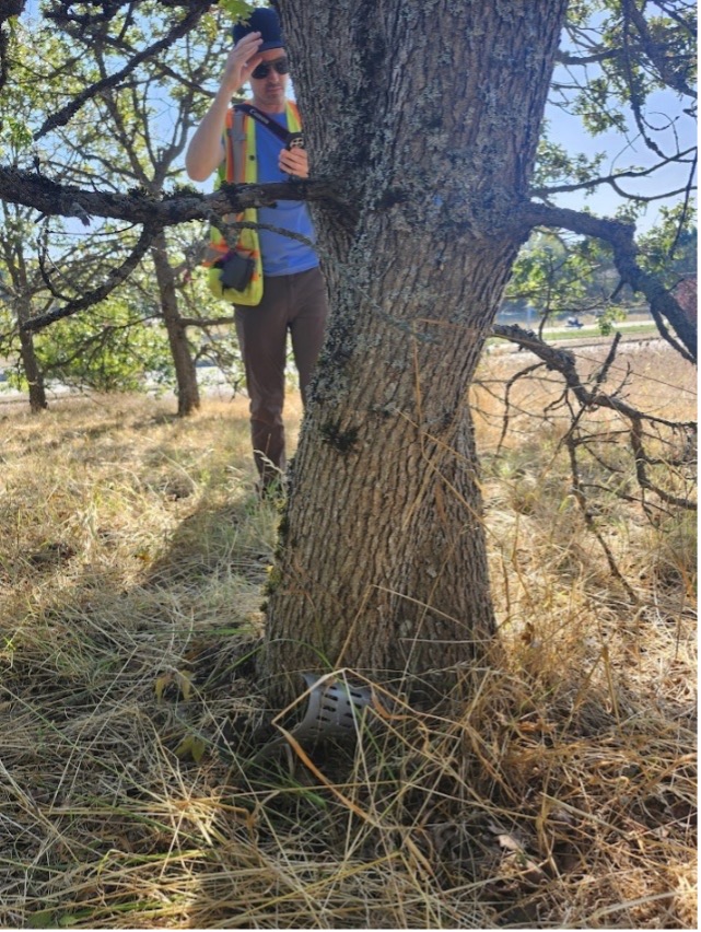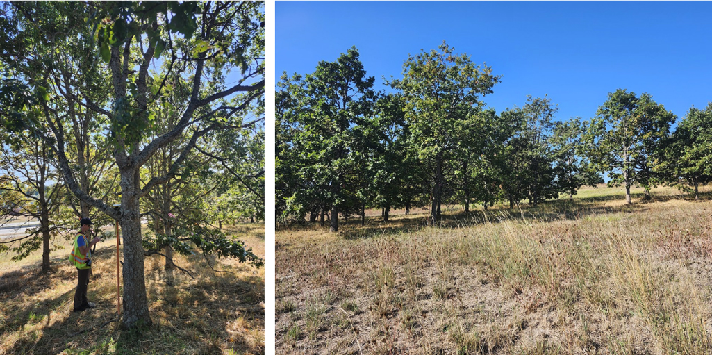Left Picture: Ryan is recording tree data using the mobile app with a GPS locator (see orange pole on the left-hand side of the Garry oak tree).