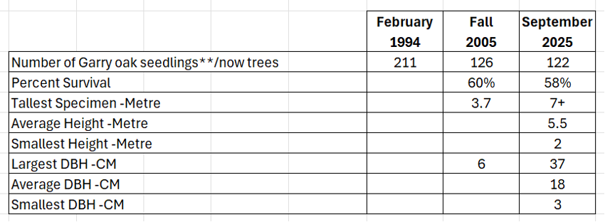 The planting clusters were inspected during March of 1994, April of 1995, and in October 1995. The writers do not have access to the records for these inspections. In the fall of 2005, Dr Michael Meagher (retired forester and honorary member of GOMPS) recorded some key measurements and statistics for the planting clusters in the GOMPS newsletter (June 2006), which form the basis of a comparison of the Garry oak trees in 2005 and 2025 (see table below).