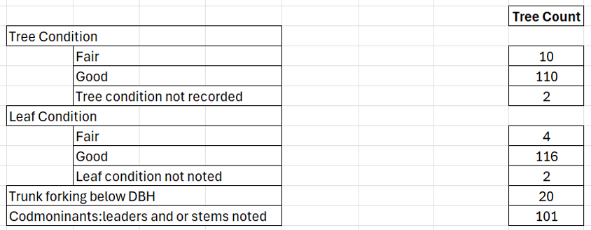 During September of 2025, two members of GOMPS (Ryan Senechal, President and Jacklyn Jolicoeur, Director visited the plantation site and recorded basic tree inventory statistics for all remaining survivors of the plantation into a mobile application. The tree data collected included the GPS coordinates, DBH (diameter at breast height), tree height, tree condition, leaf condition, and tree comments. Here is a comparison summary of the Garry oak tree data over the years.