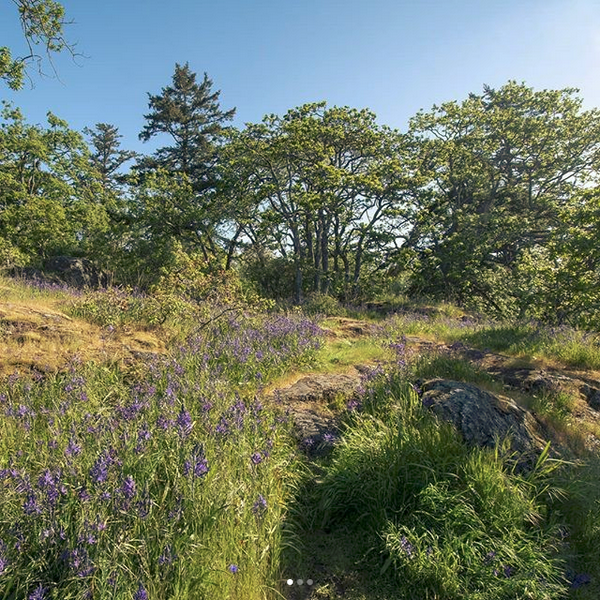 The Kwetlal food system or Garry oak ecosystem is a living artifact of the Indigenous peoples who took care of this land for generations. It is dominated by twisted, gnarled Garry oak trees and includes a mosaic of individual trees, fragmented stands of trees, woodlands, parklands, meadows, grasslands, scattered Douglas-fir stands, and open rocky areas. The forest understory is composed of shrubs, wildflowers, and other plants. At least 1,645 organisms (plants, insects, amphibians, reptiles, birds, and mammals) have co-evolved within this unique ecosystem.